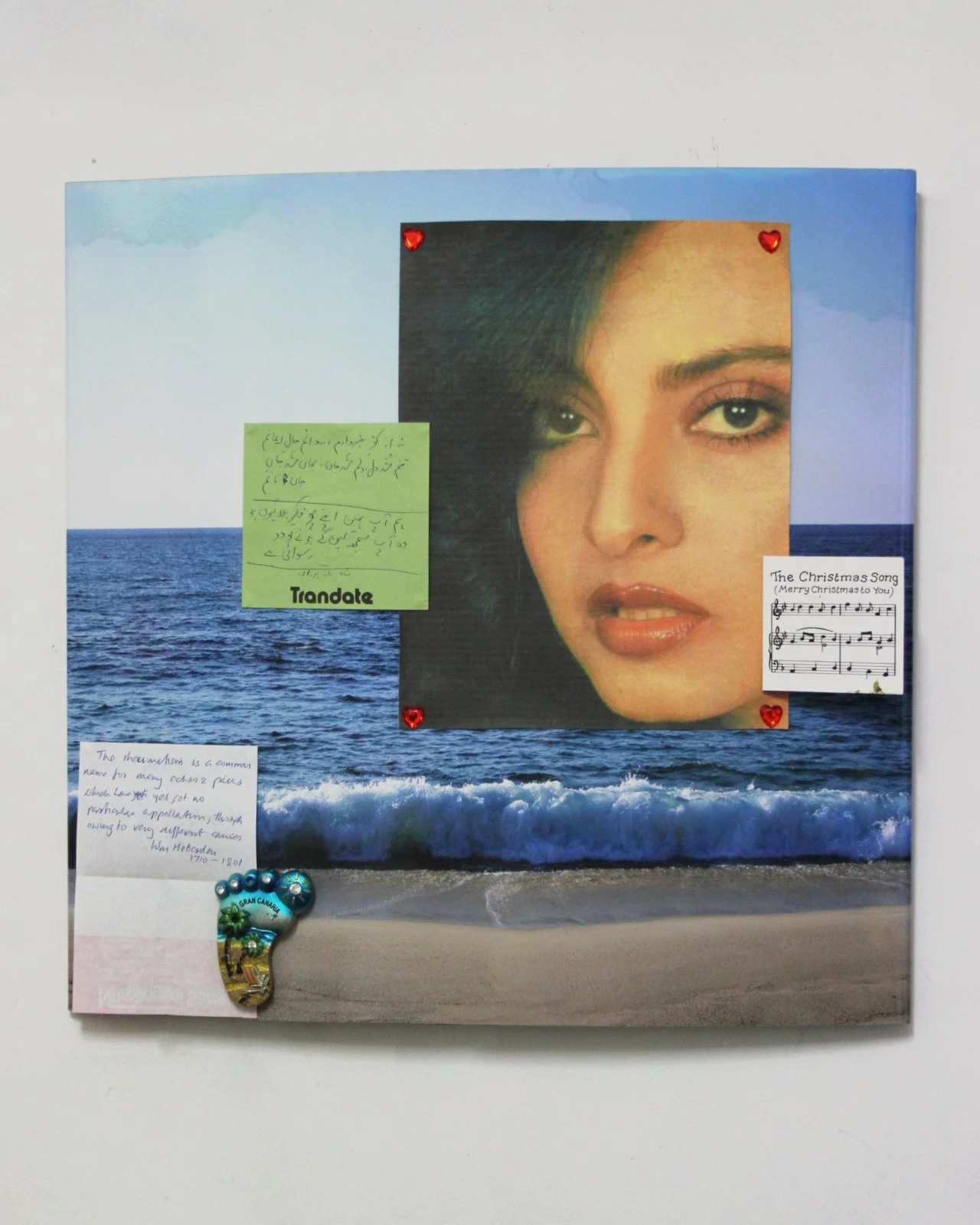 Presiding over these constructions are glamour shots of Bollywood stars, including Rekha, Amrita Arora, Aishwarya Rai Bachchan, Kajol and Rani Mukerjee. Rekha’s eyes in particular appear again and again, closely cropped and accentuated in the artworks Musical Notes, 2023, Pink Ladies, 2023, and Prem, 2023. Their persistent, multiplied stare challenges the viewer to bisect the web of gazes that suffuses the gallery and in doing so attempt to participate in the silent exchange that seems to be taking place between these otherwordly figures. The images are marked by the traces of touch and translation - fading, crumpling, discolouration - and embellished with inscriptions and childhood charms. As a result of these interventions, the images take on the status of devotional icons, materialising the desire and aspiration that these figures command as ciphers of ideal femininity within South Asia and the Indian diaspora. Placed alongside the pair’s various relics of pre-pubescent crushes - a sticker of High School Musical’s Troy Bolton, a postcard featuring the glistening abs of Aaron Taylor-Johnson - the actresses become one part of a sprawling fan culture landscape, deconstructed and restaged within the gallery space.