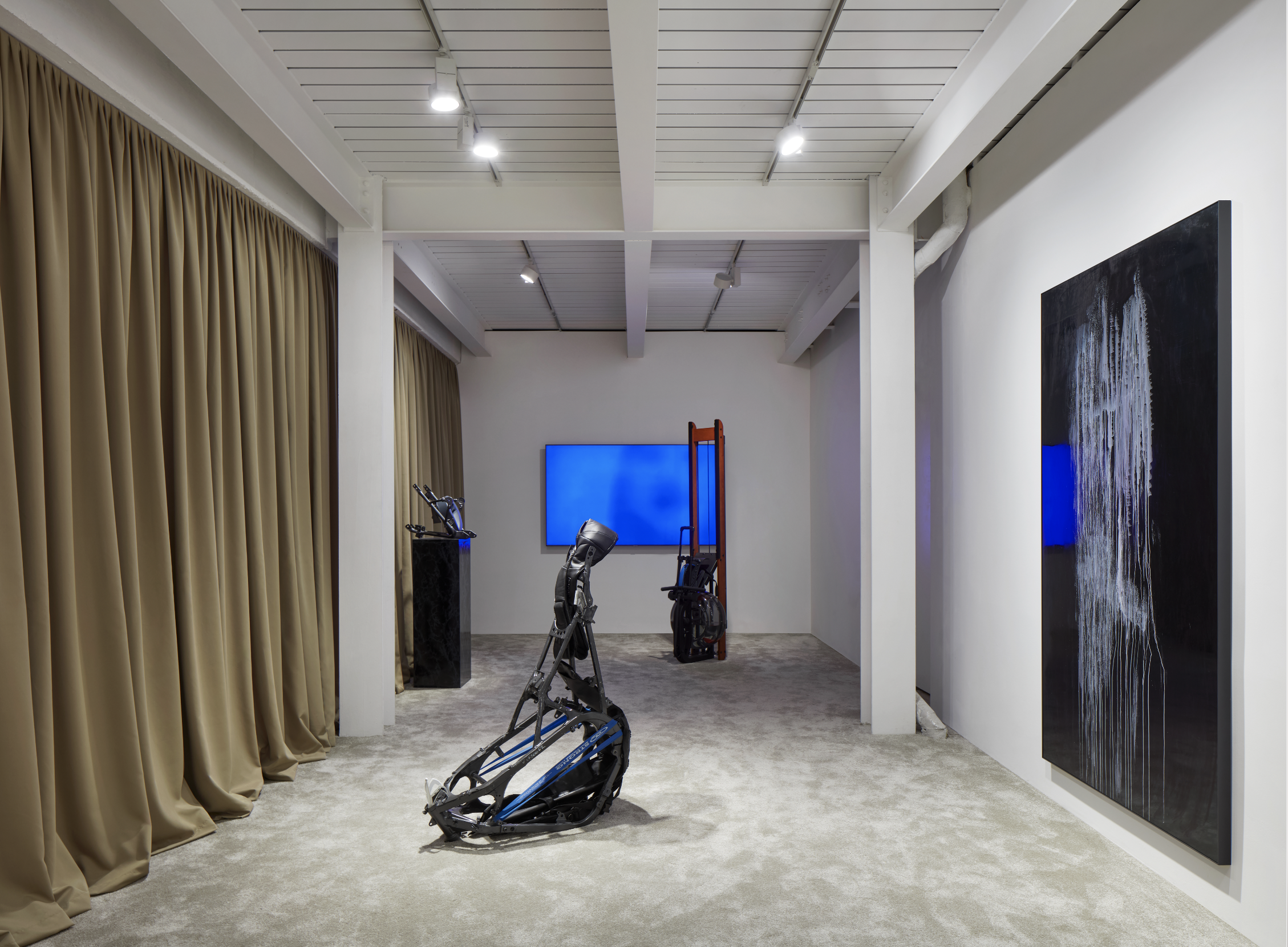 Using deconstructed fitness equipment, mechanical hardware, and components extracted from cars and furniture, Skoglösa creates sculptures that resemble exoskeletons, conjuring bodies locked into dopamine-driven feedback loops of physiological self-improvement. Through matte-black surfaces, levers, hints of ergonomic seating and taut elastic bands, Skoglösa co-opts the visual shorthand for streamlined functionality found in consumer products ranging from face massagers to Peloton bikes and Tesla interiors. The modular, reducible nature of the sculptures contrasts with Skoglösa’s paintings, which appear to emanate the sleek, viscous blackness of a dormant mobile phone. This impression of plasticine smoothness is belied by the erratic marks splattered and scratched across their surfaces, a materialisation of the frenetic anxiety that often thrums beneath our screens.