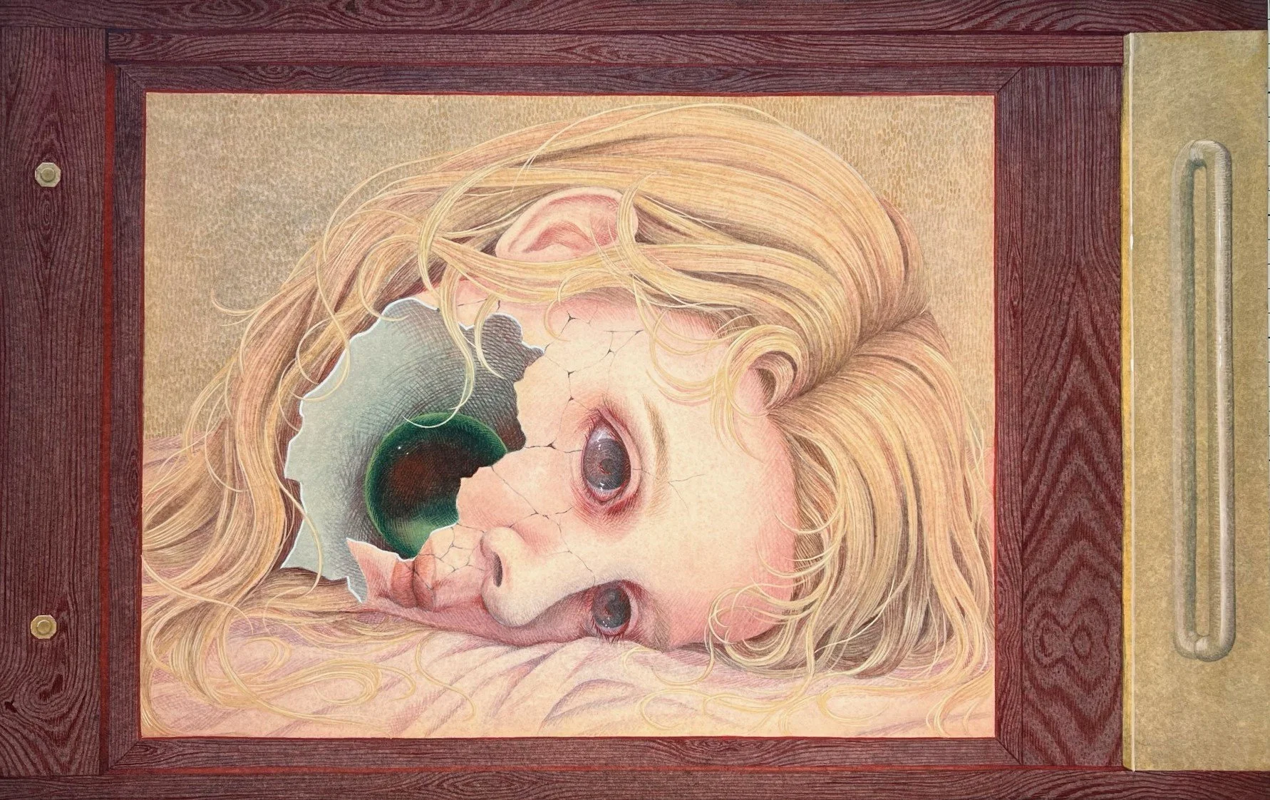 Each of Schmidt’s Trash Dolls combines refined, almost hyper-realistic coloured pencil representations with collaged elements of the ‘real thing’: crumpled bottle-caps, baggies, cigarette ash and blood spatters become indivisible from delicately rendered pencil drawings. The figures are composites of objects and goods emptied of value, husks of single-use instant gratification or perhaps compulsive addiction. Half-eaten sushi, battered Swarovski crystals and champagne corks mingle with discarded laughing-gas canisters, rusting razor blades and a range of pills and powders; these could be seen as the remnants of a life lived through commodity fetishism and dependency or the indicators of a night well spent.
