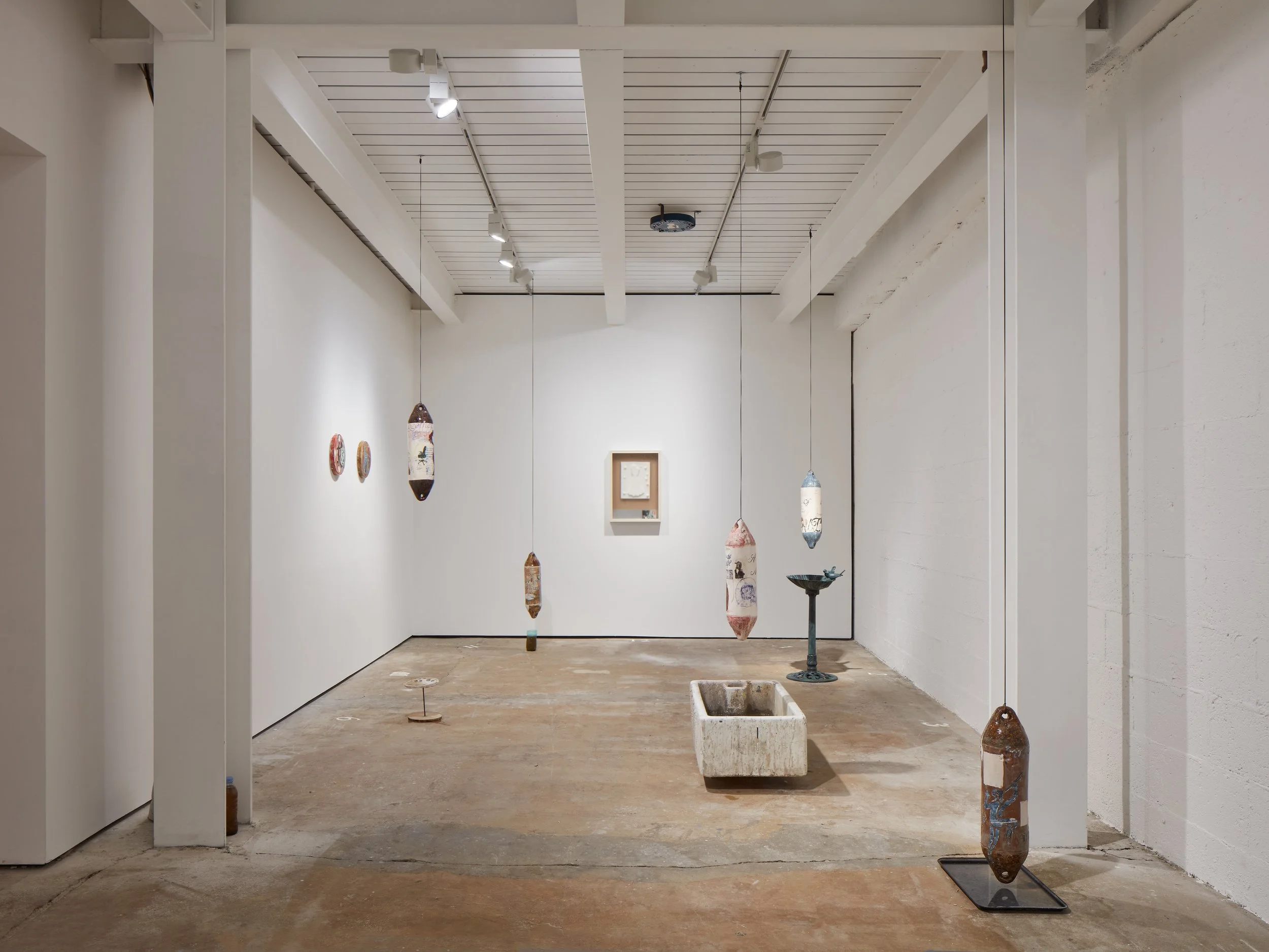 Jame St Findlay (b.1994, Scotland) uses the buoy as a sculptural refrain in the series of glazed earthenware vessels at the heart of Life Span. For the artist, the shape is almost incidental, though it contributes to the tendency of the works to speak of foreshores and things set adrift, abraded by silt and brackish water. Their suspension over makeshift pools filled with river water gives form to the primordial impulse to wish into wells; viewed in series, they remind us that the practical functioning of buoys can be talismanic - like magic charms, they signal, protect and preserve.