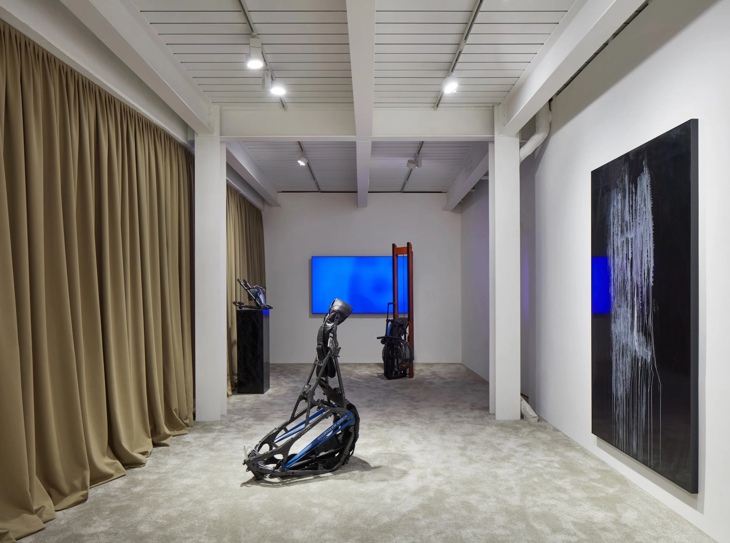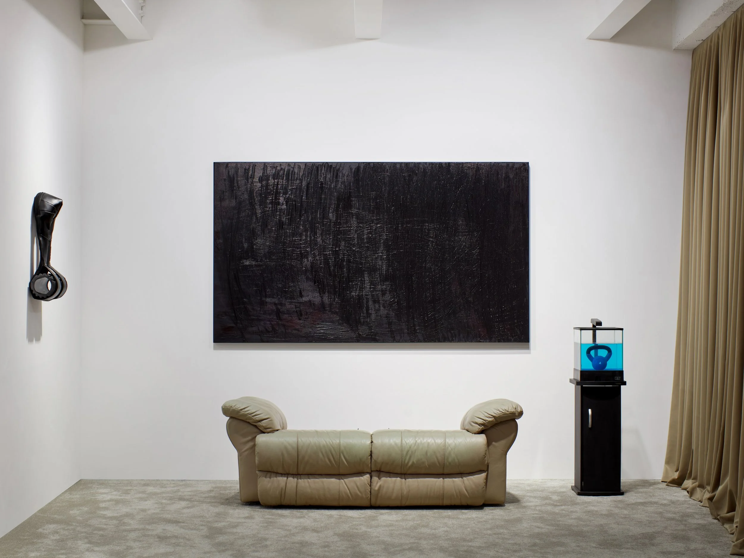 Using deconstructed fitness equipment, mechanical hardware, and components extracted from cars and furniture, Skoglösa creates sculptures that resemble exoskeletons, conjuring bodies locked into dopamine-driven feedback loops of physiological self-improvement. Through matte-black surfaces, levers, hints of ergonomic seating and taut elastic bands, Skoglösa co-opts the visual shorthand for streamlined functionality found in consumer products ranging from face massagers to Peloton bikes and Tesla interiors. The modular, reducible nature of the sculptures contrasts with Skoglösa’s paintings, which appear to emanate the sleek, viscous blackness of a dormant mobile phone. This impression of plasticine smoothness is belied by the erratic marks splattered and scratched across their surfaces, a materialisation of the frenetic anxiety that often thrums beneath our screens.